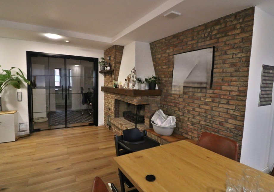 Im Eingangsbereich befinden sich ein modernes Gäste-WC sowie ein praktischer Abstellraum. Von der ersten Diele aus gelangen Sie in alle weiteren Räume. Eine Doppel-Glastür zum Wohn-/Esszimmer sorgt für ein großzügiges Raumgefühl und viel Tageslicht. Der offene Kamin verleiht dem Wohnbereich an kühlen Tagen eine besonders gemütliche Atmosphäre.